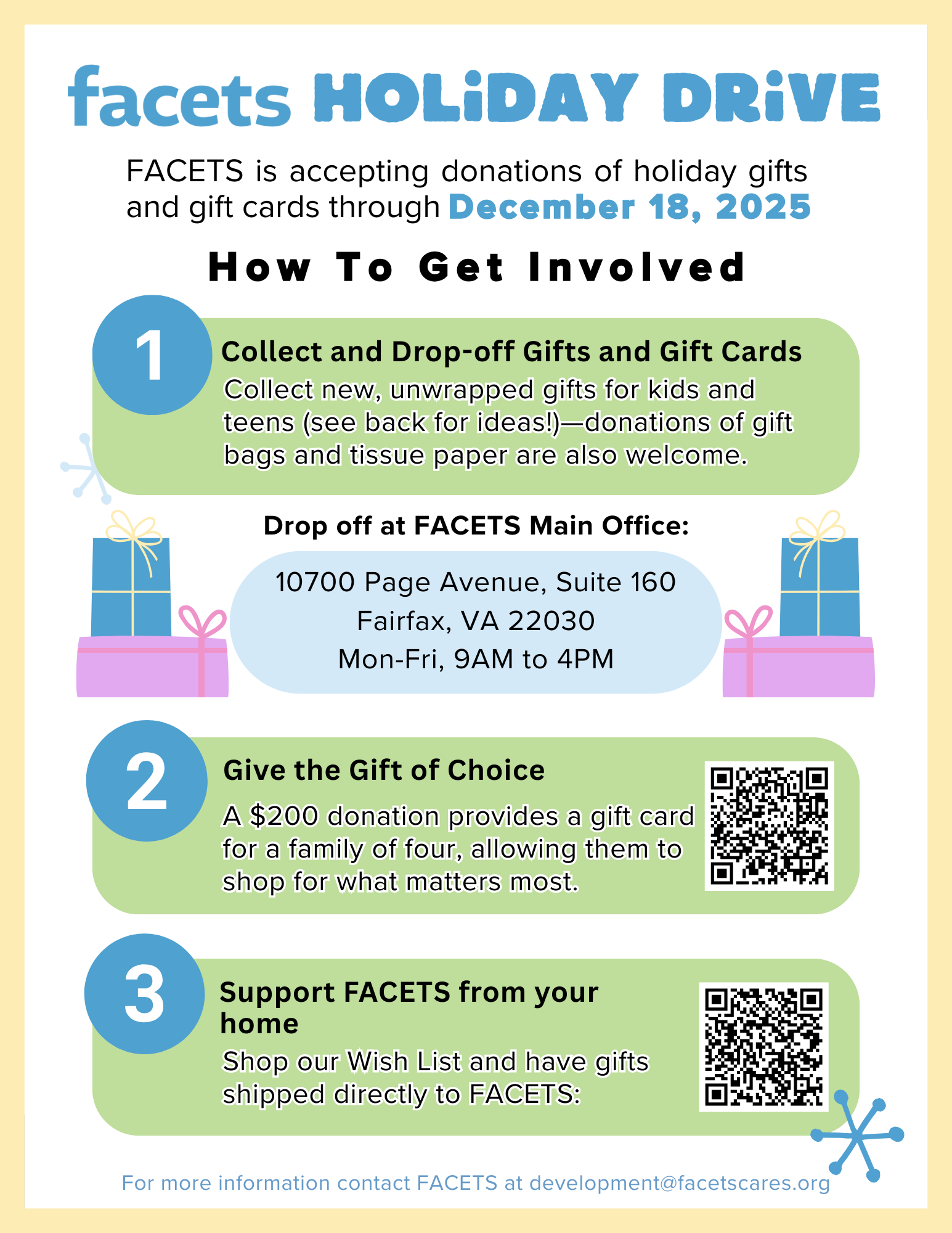 Join us in supporting the FACETS Holiday Gift Drive for the 2025 holiday season! We’re currently collecting gifts and gift cards to reach our goal of bringing joy to 600 children and neighbors in need. Your generosity can make a meaningful impact this year!