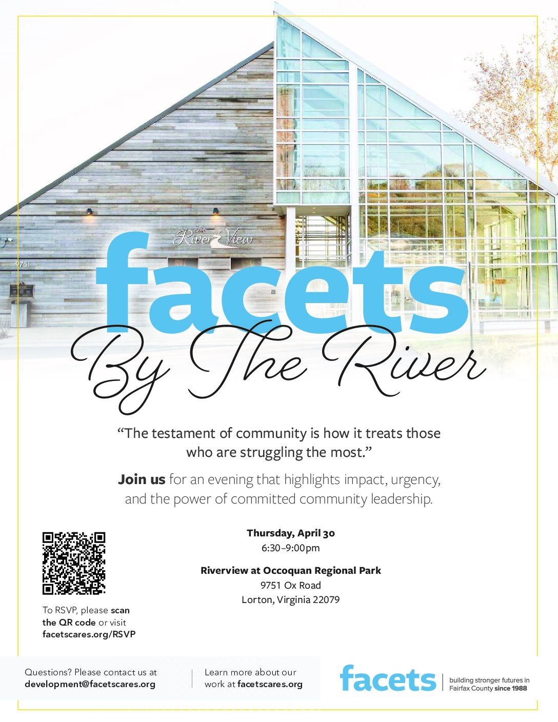Join Fairfax County’s community leaders and change-makers at FACETS’ annual fundraiser. FACETS by the River highlights the impact your support makes for neighbors facing homelessness and housing instability across our community.